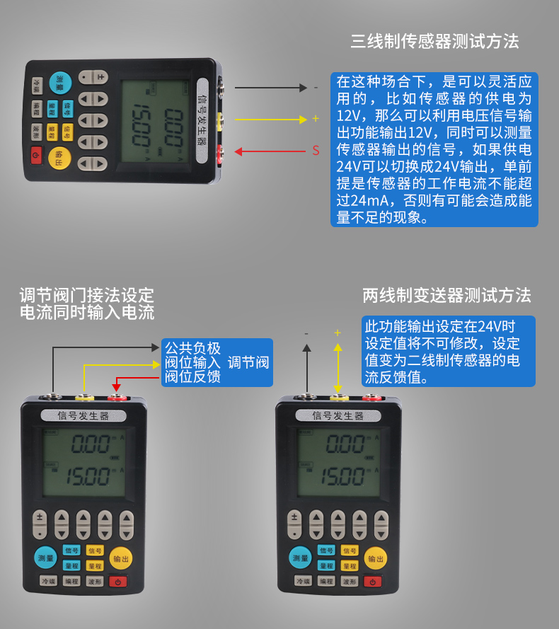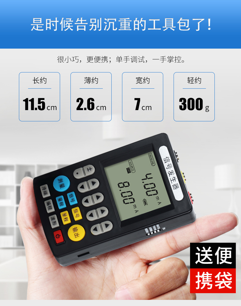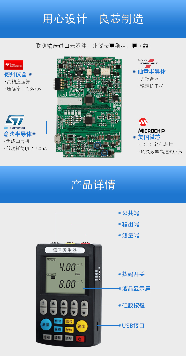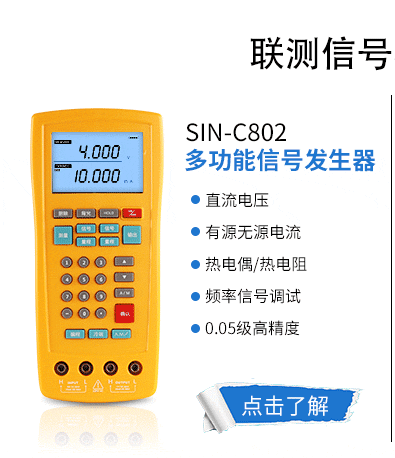 信號發生器具有多種信號的測量和輸出功能,包括電壓、電流、熱電偶,采用高清LCD液晶屏和功能分明的硅膠按鍵,操作簡單,待機時間長,精度高,并且具有可編程輸出的功能。