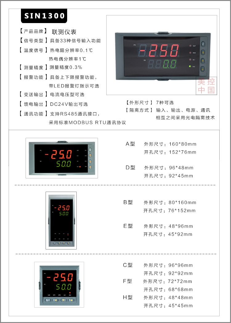 SIN-1300模糊 PID 溫控器/調節儀采用模糊 PID 算式,無需人工整定參數,控溫精度基本達±0.5℃,無超調、欠調,性價比高。傻瓜式操作,7 款外型尺寸,支持 33 種信號輸入功能。