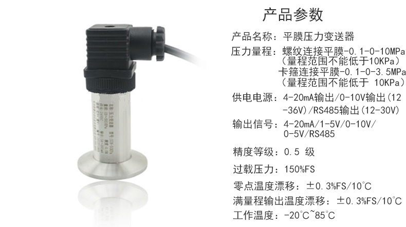 平膜結構壓力變送器采用波紋膜直接感受壓力。傳 感器平膜片防止了污垢,不衛生及粘稠液體堵塞等問題。 具有體積小、重量輕、長期穩定性好等特點,廣泛應用 于食品、醫藥、衛生及釀酒工業等行業。
